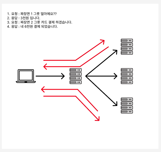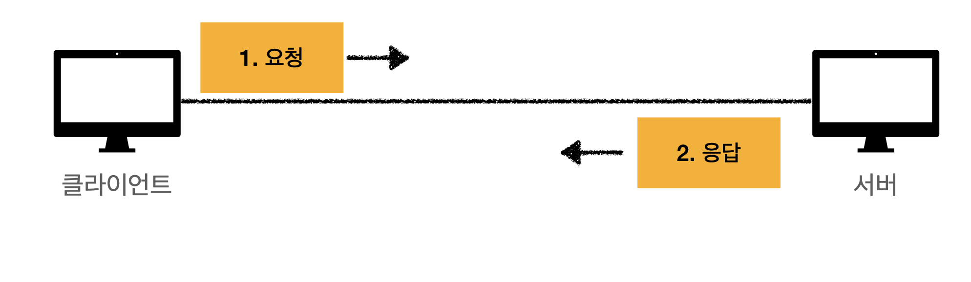 Request와 Response구조이며 클라이언트는 서버에게 요청을 보내고 응답을 대기한다. 서버는 요청을 받아 결과를 만들어 클라이언트에게 응답한다.