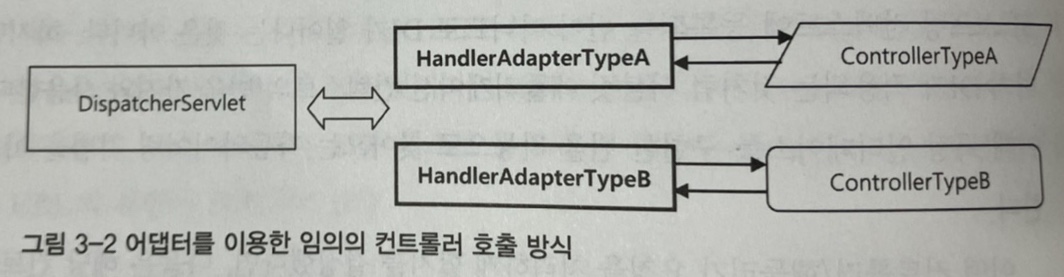 대신 컨트롤러 종류에 따라 적절한 어댑터를 사용하여 어댑터가 담당하는 컨트롤러에 맞는 호출 방법을 이용해서 컨트롤러에게 작업 요청을 보내고 결과를 돌려 받아서 DispatcherServlet에게 다시 전달해주는 방식을 사용하고 있습니다.