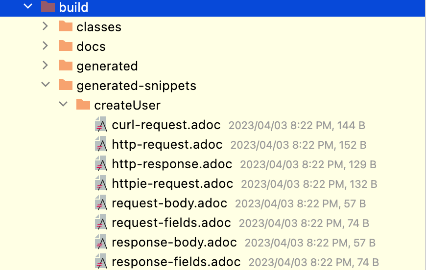 이렇게 테스트 코드를 작성 후 테스트가 성공하게 되면 아까 build.gradle에서 지정했던 build/generated-snippets 경로에 테스트 결과에 대한 문서 조각들이 생성이 됩니다.