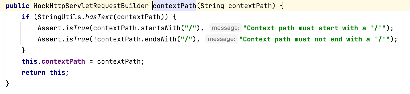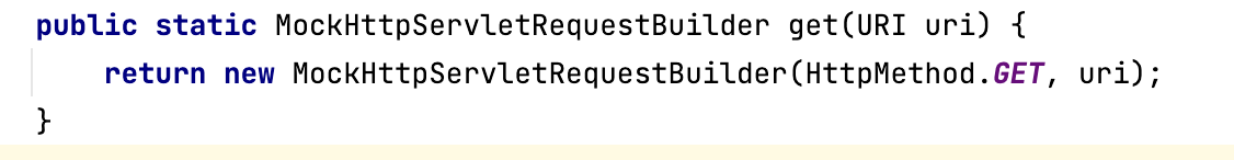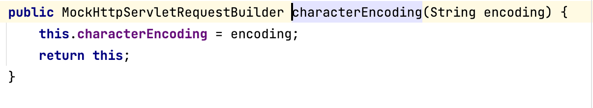 defaultCommonRequest() 메소드에서는 MockMvcRequestBuilders.get() 메소드를 사용하였는데 post(), put(), multipart() 등 아무거나 사용하셔도 무관합니다. 메소드 파라미터에 기본적으로 적용할 uri를 넣어주시면 MockHttpServletReqestBuilder 객체를 생성하게 됩니다. 이렇게 생성된 MockHttpServletReqestBuilder 객체를 가지고 contextPath(), contentType(), characterEncoding() 메소드를 사용해서 속성을 적용하게 되면 메소드 모두 get() 메소드에서 생성한 MockHttpServletReqestBuilder 객체 자기 자신(this)을 반환하게 됩니다.