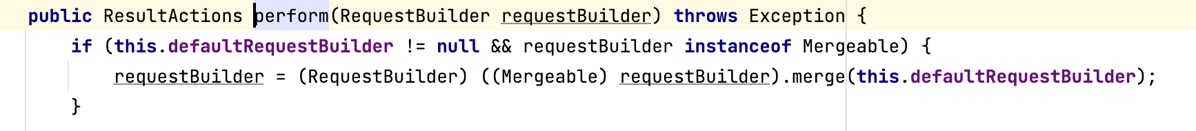 밑의 사진은 perform() 메소드의 일부인데 메소드를 자세히 보시면 defaultRquestBulider가 null이 아닐 때 instanceof를 이용하여 들어온 파라미터가 Mergeable 타입인지 비교 후 Mergeable 타입이 맞으면 들어온 파라미터인 reuquestBulider와 defaultRequestBuilder를 merge 하는 코드를 볼 수 있습니다.