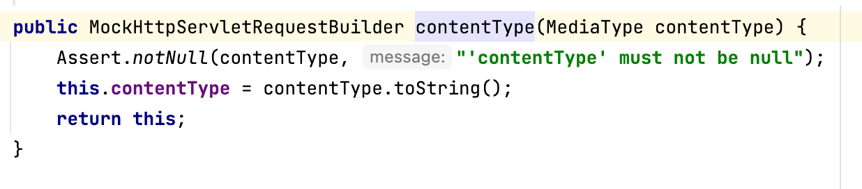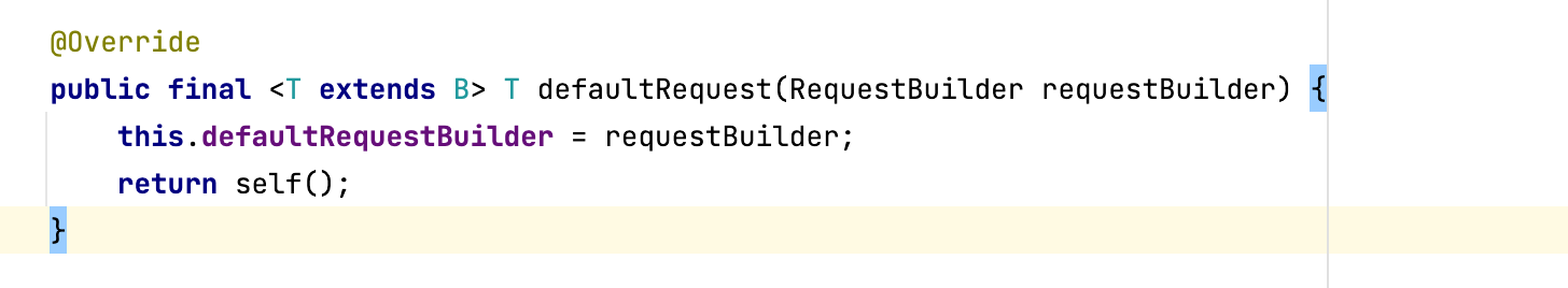 그리고 위의 제가 작성한 코드를 보시면 defaultRequest() 메소드를 호출하면서 파라미터로 MockHttpServletRequestBuilder(RequestBuilder의 구현체) 객체를 반환하는 defaultCommonReqeust() 메소드를 파라미터로 넣어주었고 defaultRequest() 메소드는 전달받은 파라미터를 defaultRequestBuilder 필드에 넣어주게 됩니다.
