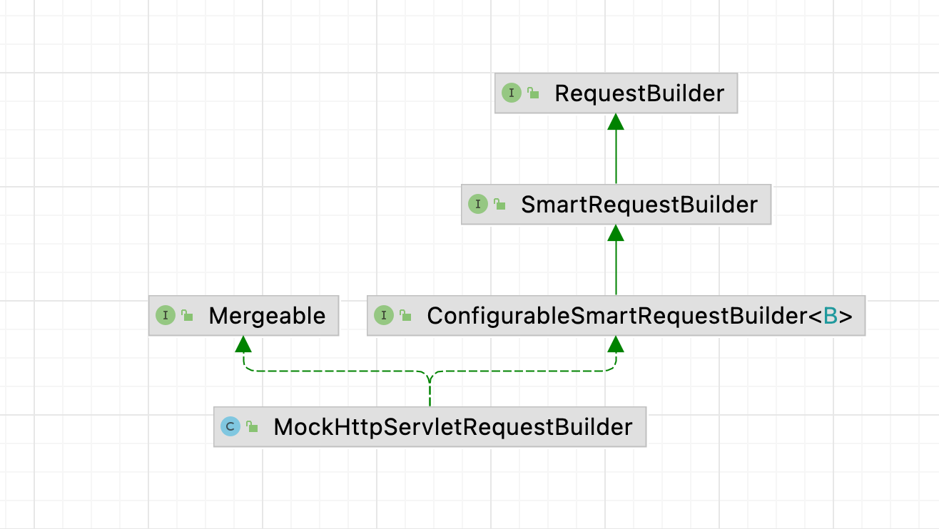 이렇게 만들어진 defaultCommonRequest() 메소드는 테스트 코드가 실행되기 전 실행되는 @BeforeEach 어노테이션이 적용된 setUp() 메소드에defaultRequest() 메소드 안에 파라미터로 넣어줬습니다. defaultRequest() 메소드의 파라미터는 인터페이스인 ReuqestBuilder 타입을 넣어주게끔 되어있는데 제가 만든 defaultCommonRequest() 메소드의 반환 타입은 RueqestBuilder의 구현체인 MockHttpServletRequestBulider이기 때문에 defaultRequest() 메소드의 파라미터로 넣어줄 수 있게 됩니다. (밑의 클래스 다이어그램을 참고하시기 바랍니다.)