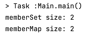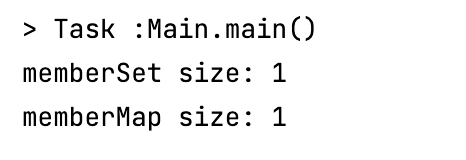 결과는 예상한 대로 memberSet, memberMap의 size 출력시 1이 나오게 됩니다.