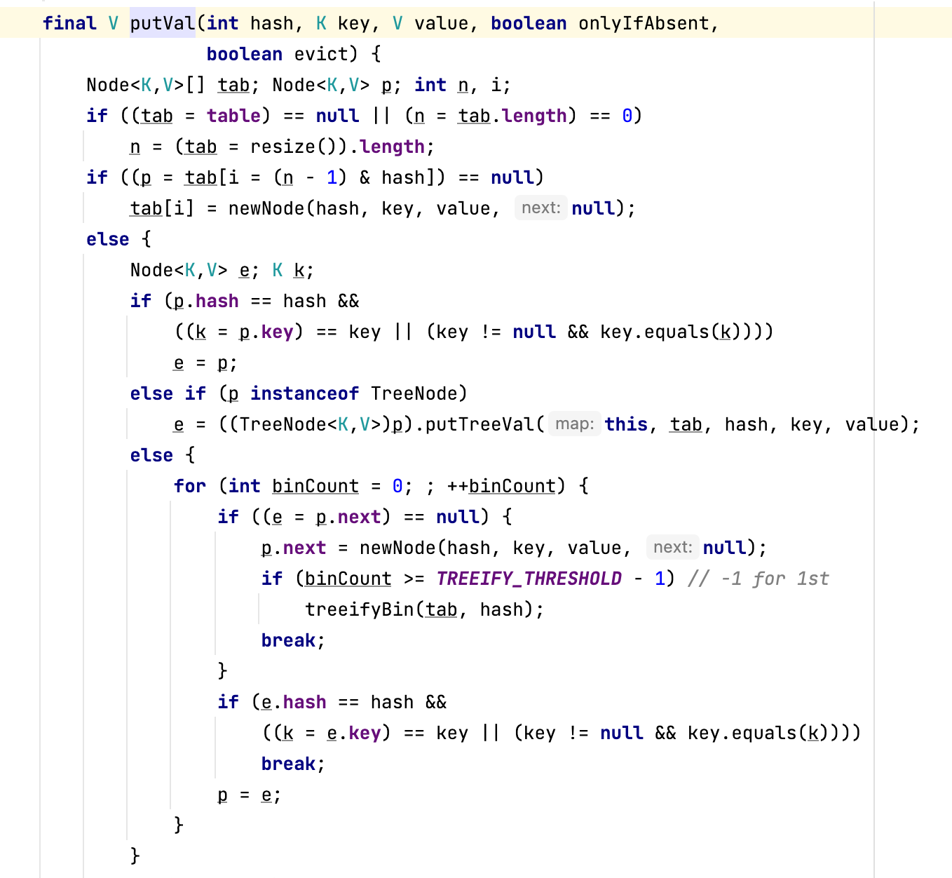 put() 메서드 바디에 putVal() 메서드의 매개변수를 보시면 hash(key)라는 메서드를 볼 수 있는데 이 메서드의 내부 코드를 보면 hashCode() 메서드를 호출하는 것을 볼 수 있습니다. 그리고 putVal() 메서드의 else 문안의 코드를 보시면 hash 값과 equals() 메서드를 사용하여 key 값이 동일한 객체인지 판별하는 코드를 보실 수 있습니다.