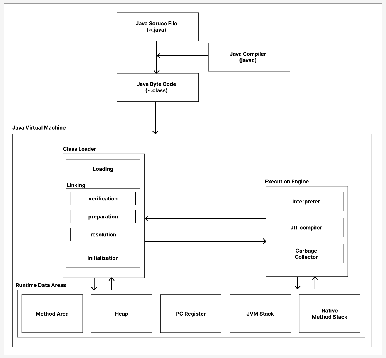 자바 컴파일러를 통해서 컴파일된 바이트 코드가 JVM의 Runtime Data Areas에 올라가기까지의 과정은 이렇습니다.
