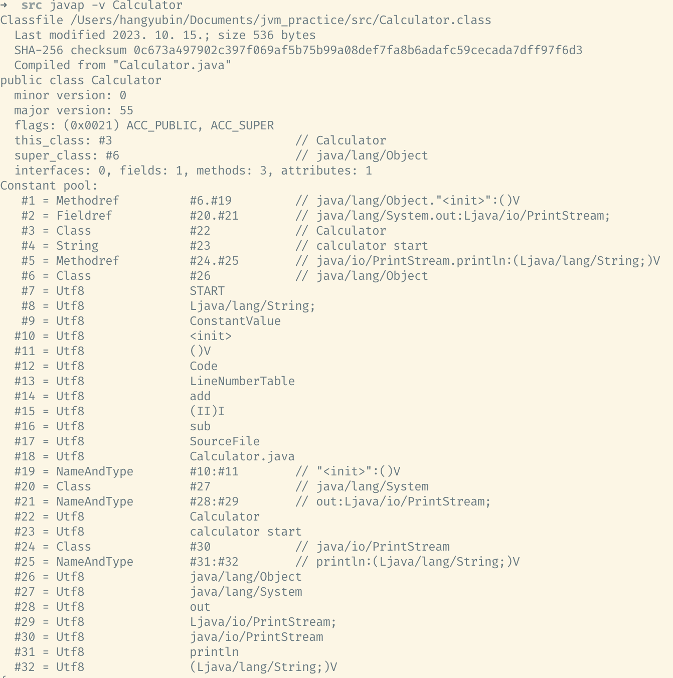 javap 명령어에 -v 옵션을 주어 바이트 코드를 디어셈블하게 되면 Class Loader의 Linking 과정 중 resolution 단계에 등장하는 Runtime Constant pool의 심볼릭 레퍼런스를 보실 수 있습니다. 심볼릭 레퍼런스는 상수 풀 내의 항목을 참조하기 위해 사용되며 #번호 부분은 Constant pool의 인덱스입니다. 이 인덱스 번호를 통해 해당 클래스에서 사용되는 메세드 및 필드를 참조하게 됩니다.