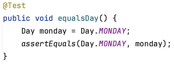 enum type을 사용해보신 개발자분들은 enum type은 singleton이다 라는 말을 한 번 쯤은 들어보셨을 거 같은데요 singleton이라면 밑의 테스트 코드가 통과를 해야할텐데 한 번 실행해 보도록 하겠습니다.