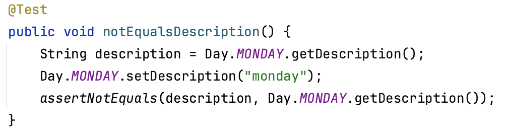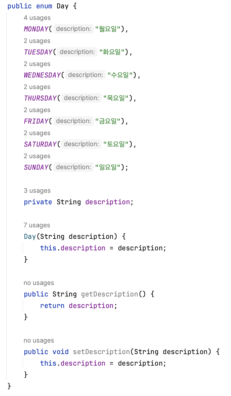 위에서 말씀드린 것처럼 enum type은 singleton 객체입니다. 즉, 멀티 스레드 환경에서는 상태를 바꿀 수 있는 행위인 setDescription 같은 메서드는 원하지 않은 결과가 나올 수 있기 때문에 상태도 꼭 final 키워드를 사용해 상수로 사용하는 것이 좋습니다.