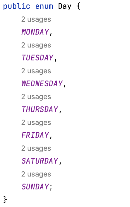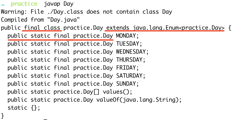 그리고 enum type에 선언한 필드가 Day type으로 결정되고 public static final keyword가 추가된 것을 볼 수 있습니다.