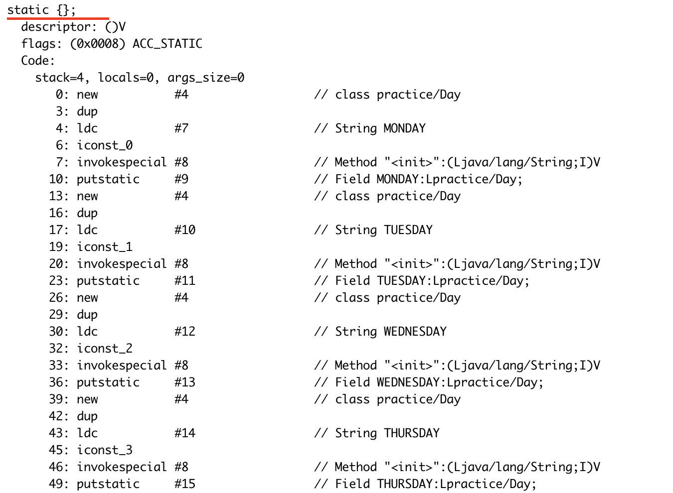 enum type을 컴파일하게 되면 컴파일러가 static initializer block을 추가하여 Day 클래스 내부에 선언된 정적 상수 필드에 대해서 초기화해주는 코드를 추가해 주게 됩니다. 드디어 제가 가졌던 궁금증이 다 풀렸습니다!