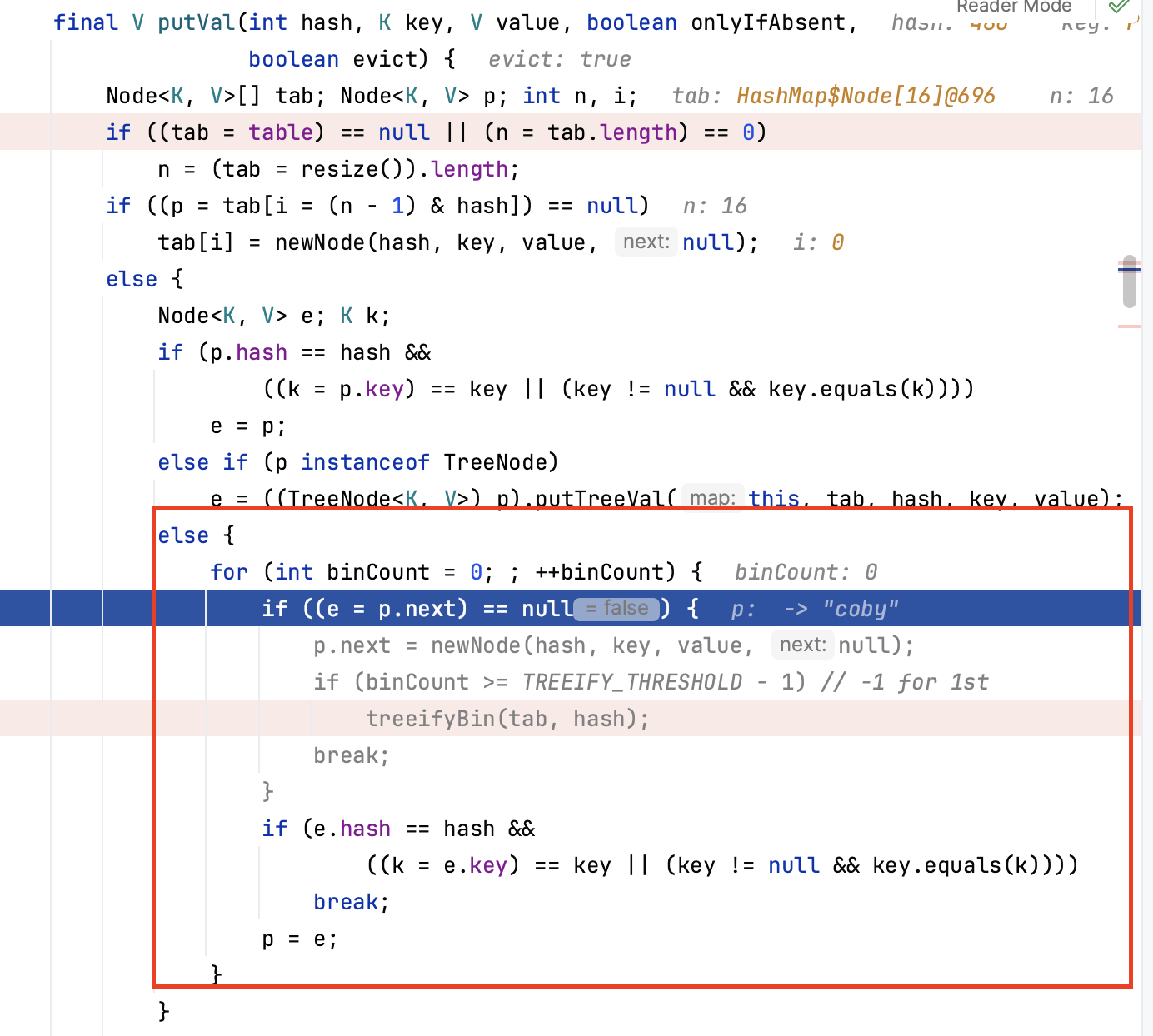 사진에서 빨간 네모 부분을 보시면 Hash Collision 발생 시 Node의 next가 null이면 next에 새로운 Node를 생성하여 연결해 주는 것을 볼 수 있습니다.