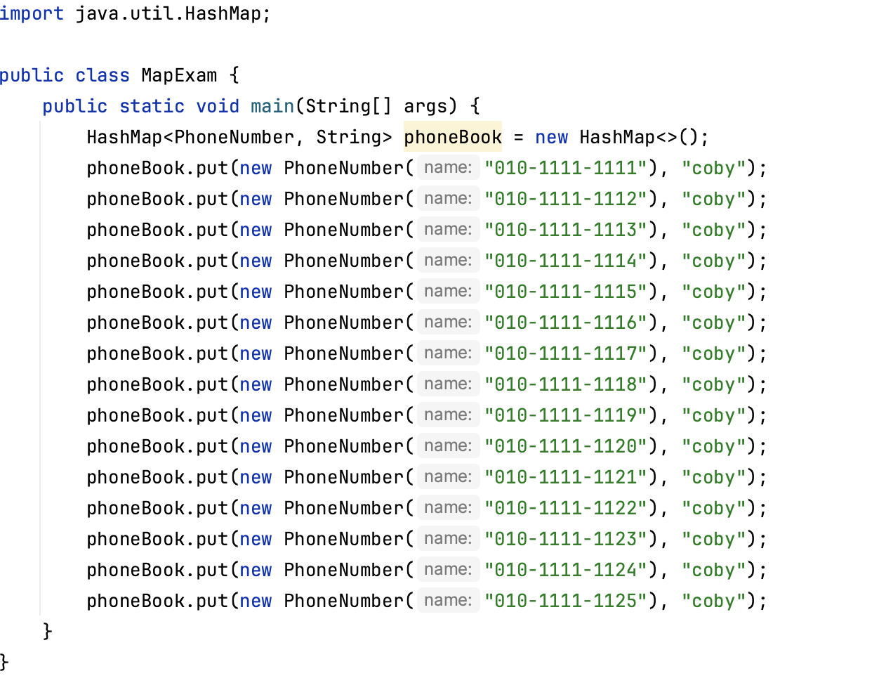 밑의 예제는 Key로 전화번호를 가지고 Value로 이름을 가지는 HashMap을 선언하여 한 사람이 여러 개의 핸드폰을 사용하고 있는 경우를 표현한 예제입니다.