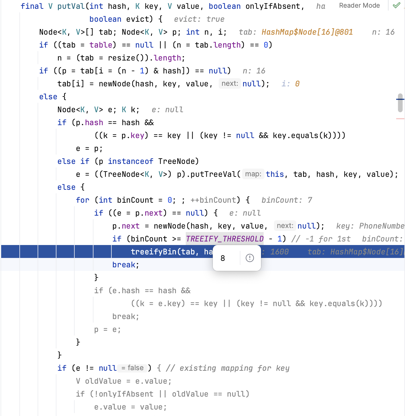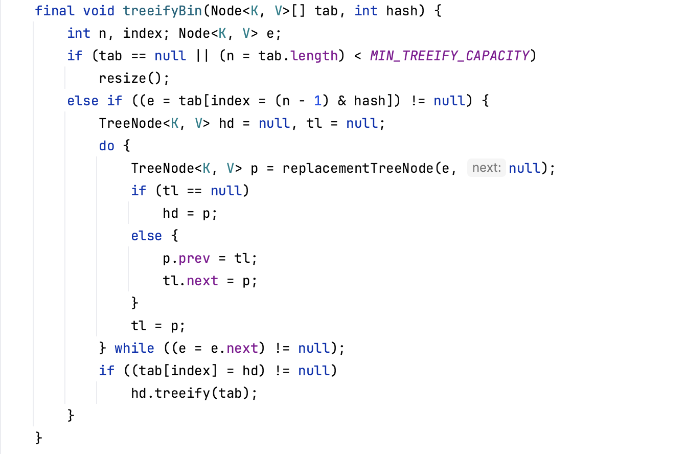 또한 밑의 사진처럼 특정 index에 대한 Hash Collision 횟수가 TREEIFY_THRESHOLD 상수 값에 1을 뺀 것 보다 크거나 같으면 treeifyBin() 메서드를 호출해 Hash Table을 resizing 하거나 Linked List -> Tree 구조로 바꾸는 것을 보실 수 있습니다.