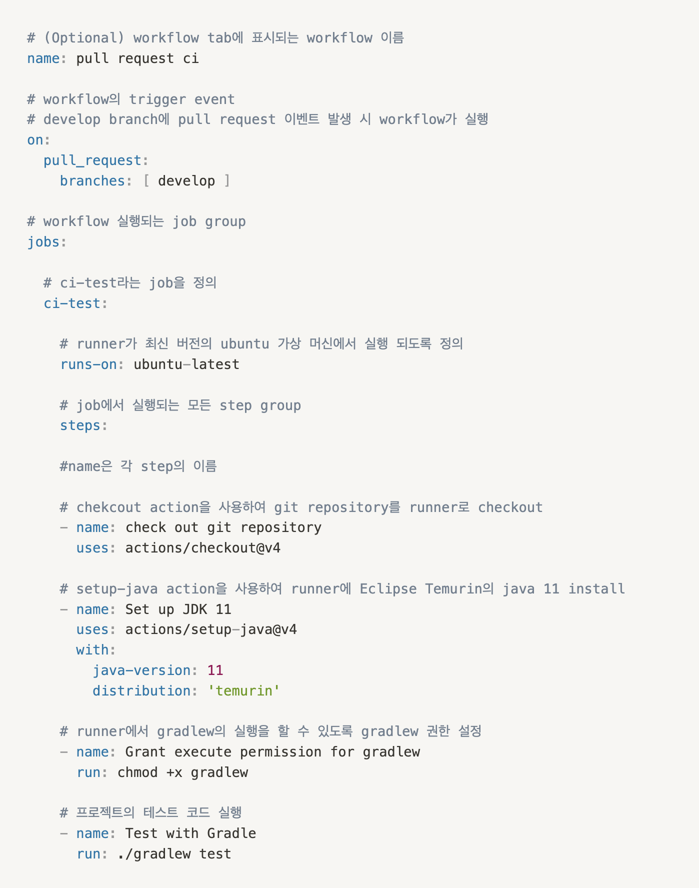 CI는 develop 브랜치에 pull request trigger가 발생 시 workflow가 실행되도록 하였습니다.