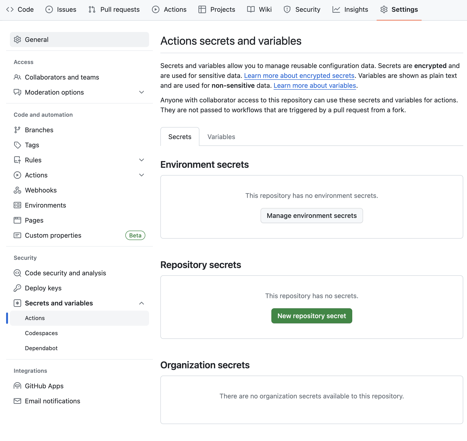 접속이 잘 되셨다면 github repository > Settings > Secrets and variables > Actions 탭으로 이동을 하신 후 new repository secret 버튼을 눌러 workflow의 runner가 ssh를 사용하여 프로젝트를 배포할 원격 서버에 접속할 수 있게 생성한 private key와 원격 서버의 username과 ip를 actions secret에 등록을 하겠습니다.