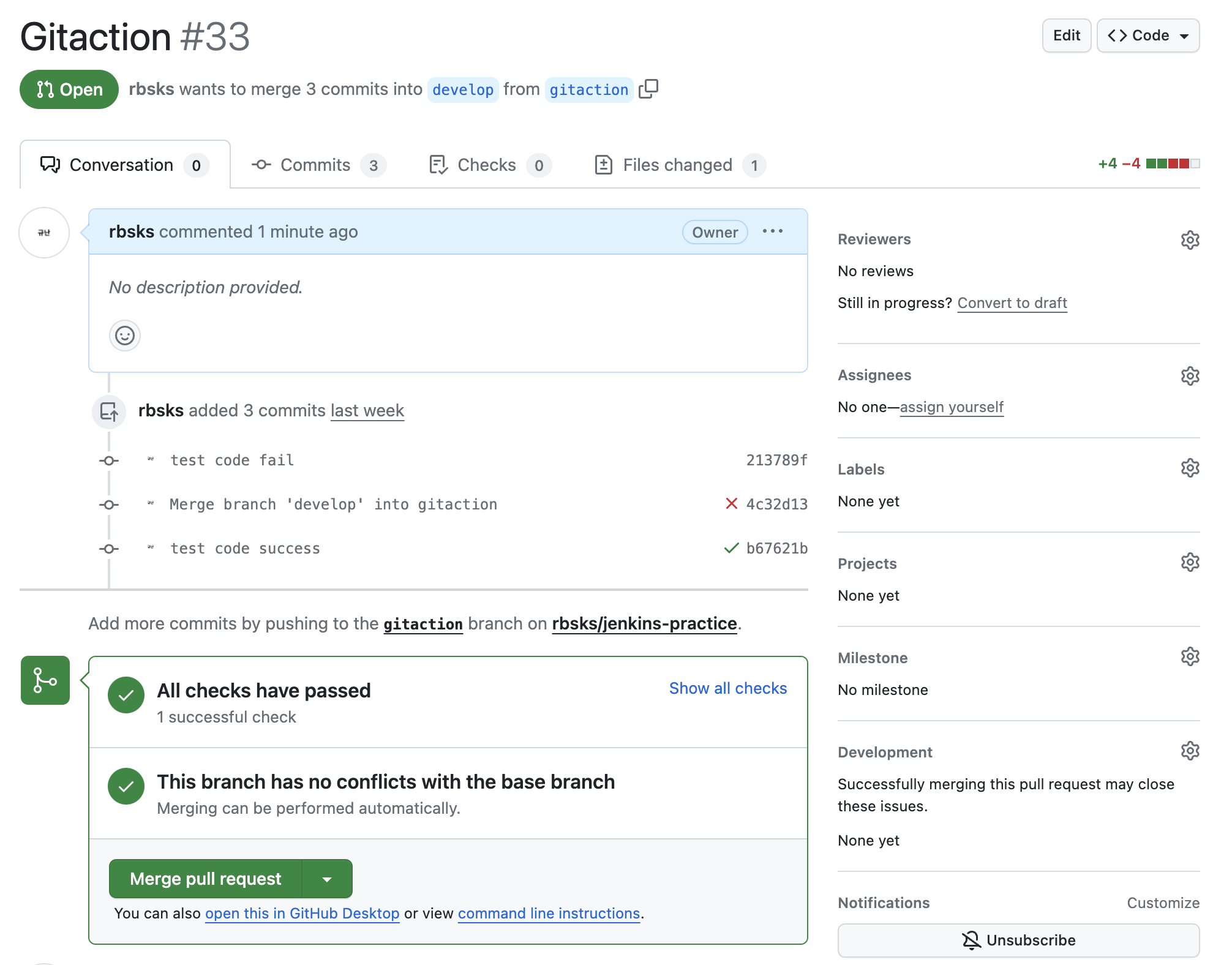 코드를 작성 후 another branch에서 develop branch로 pull request 요청 보내게 되면 GitHub Actions workflows에 정의한 CI workflow가 실행되는 것을 볼 수 있습니다.