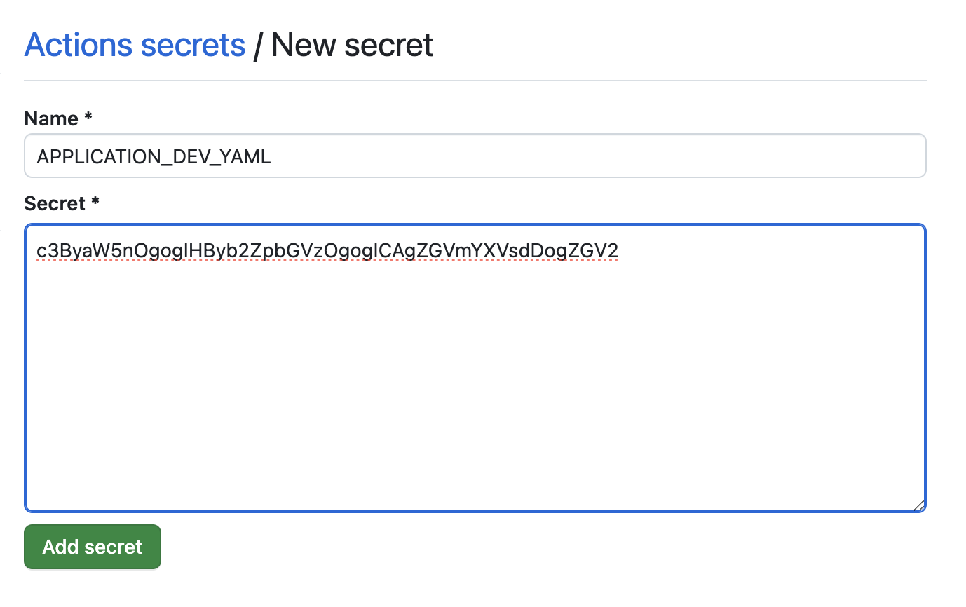 다음으로 public repository를 사용는 경우 application.yml의 DB 접속 정보, jwt secret key 등 중요 정보들에 대한 외부 노출을 막기 위해 secret에 배포용 yml을 등록해 보도록 하겠습니다. secret에 yml에 등록 시 base64로 encoding 해서 올려야 workflow 실행 시 실패하지 않습니다.