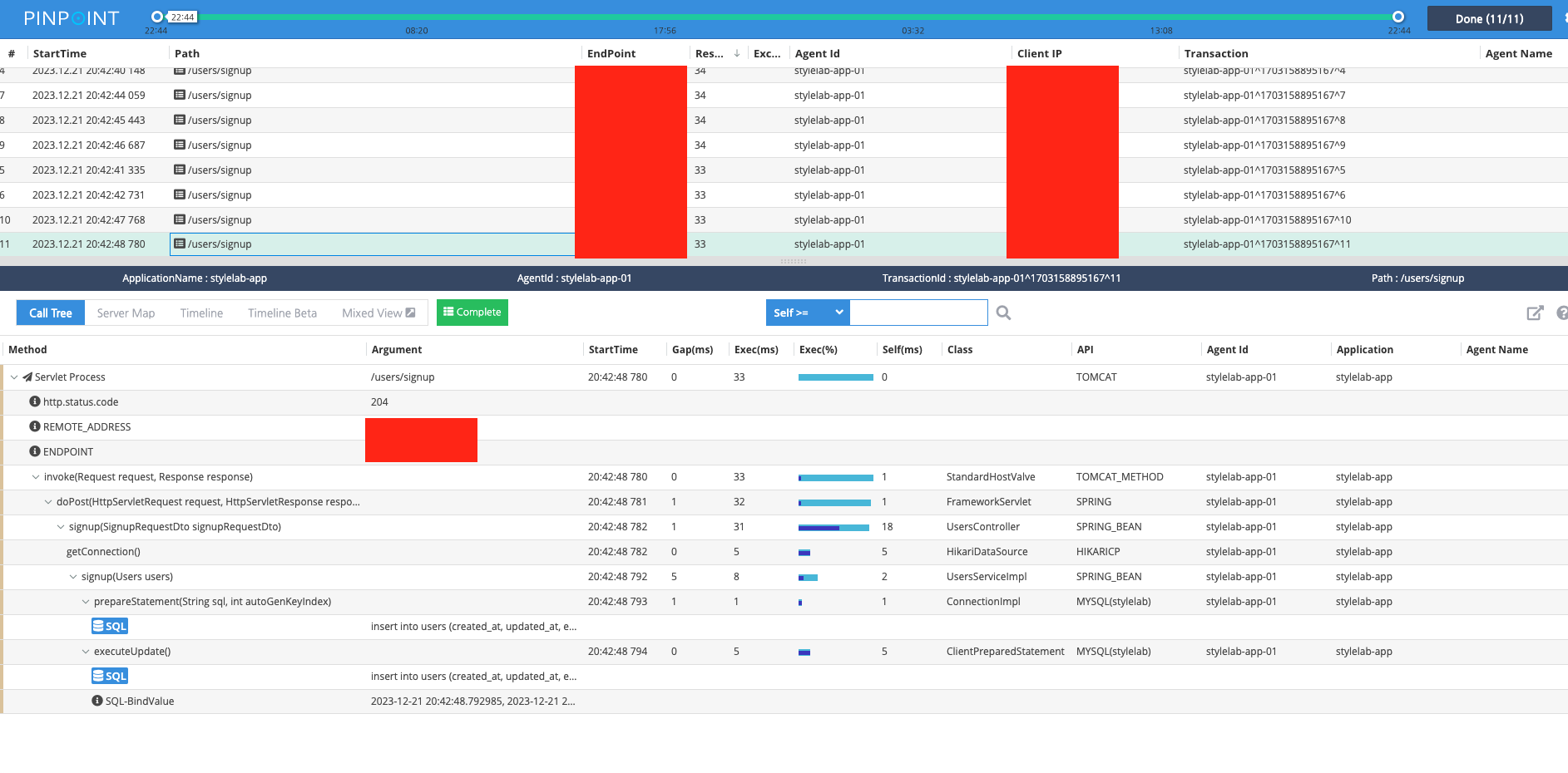 Server Map에서 Request/Respone Scatter chart의 scatter를 마우스로 드래그하시면 transaction list를 볼 수 있는 페이지로 이동하게 되는데 이 페이지에서 상세한 Call Stack을 보실 수 있습니다. 부하 테스트 시 이 Call Stack을 보고 어느 부분에서 병목 현상이 나타나는지 쉽게 확인할 수 있다는 장점이 있습니다.