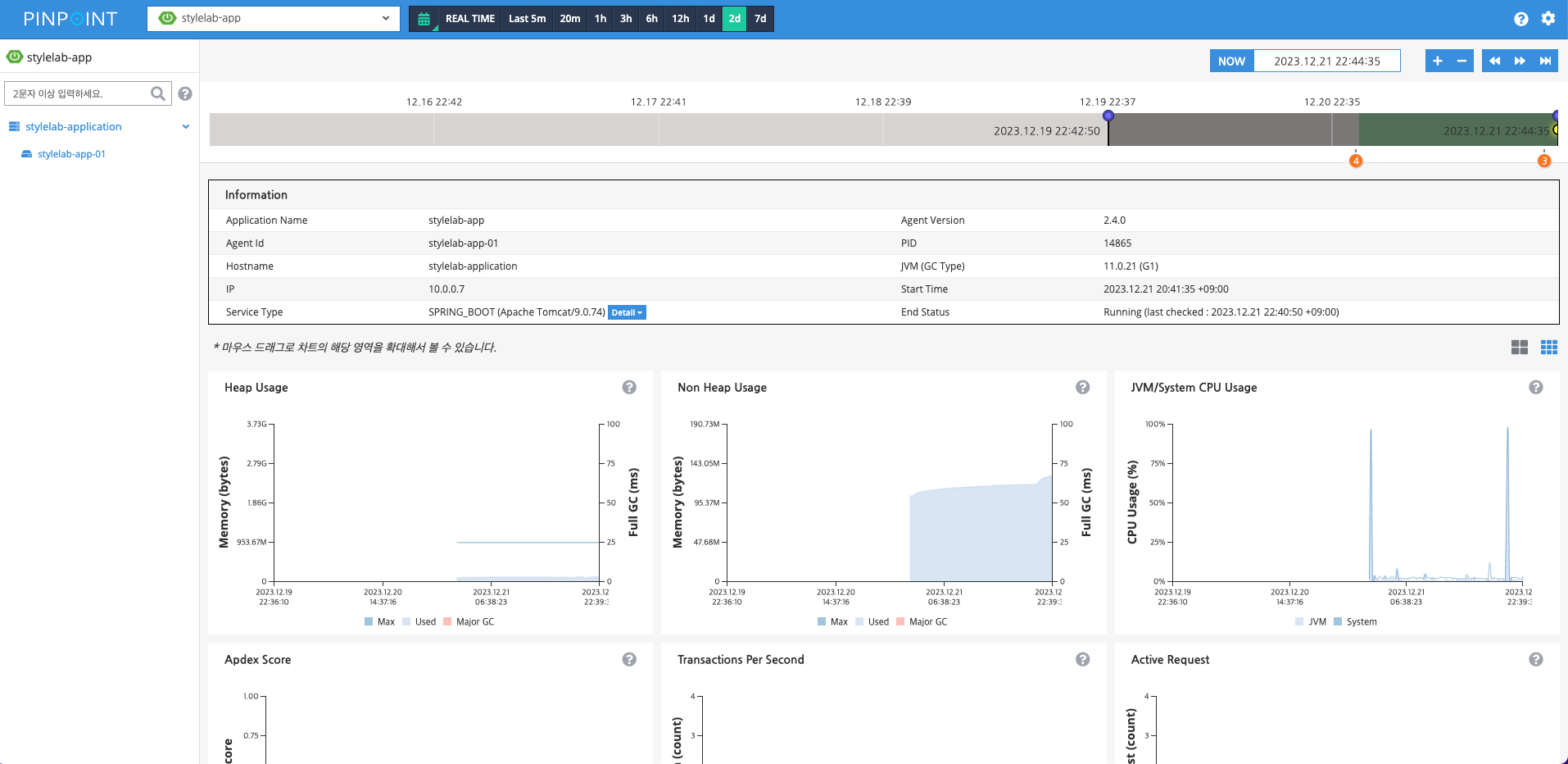 CPU 사용량, 메모리/가비지 컬렉션, TPS, JVM arguments 등 애플리케이션에 대한 추가 세부 정보를 볼 수 있습니다.