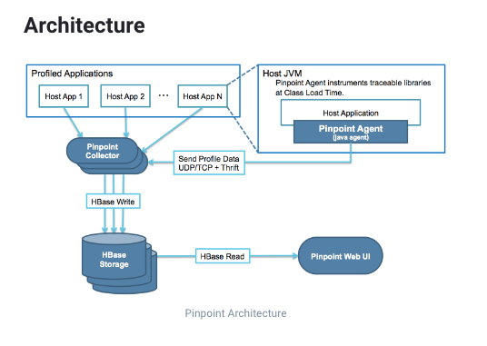pinpoint의 architecture를 보시면 크게 Pinpoint Agent, Pinpoint Collector, Pinpoit Web UI, HBase Storage로 구성되어 있는 것을 보실 수 있습니다. 각 역할은 다음과 같습니다.
