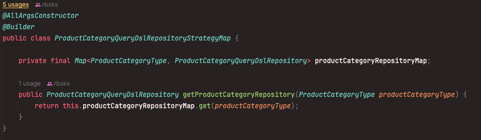 productCategoryRepositoryMap은 ProductCategoryQueryDslRepositoryStrategyMap 타입이며, EnumMap<ProductCategoryType, ProductCategoryQueryDslRepository>을 인스턴스 변수로 가집니다. 또한, ProductCategoryType을 파라미터로 받아 ProductCategoryQueryDslRepository를 반환하는 getProductCategoryRepository() 메서드를 포함합니다.