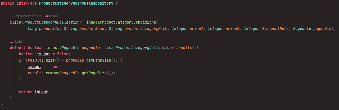 Value인 ProductCategoryQueryDslRepository는 interface로 productCategoryPath에 매핑되는 partitioning category repository에서 구현하게 됩니다.