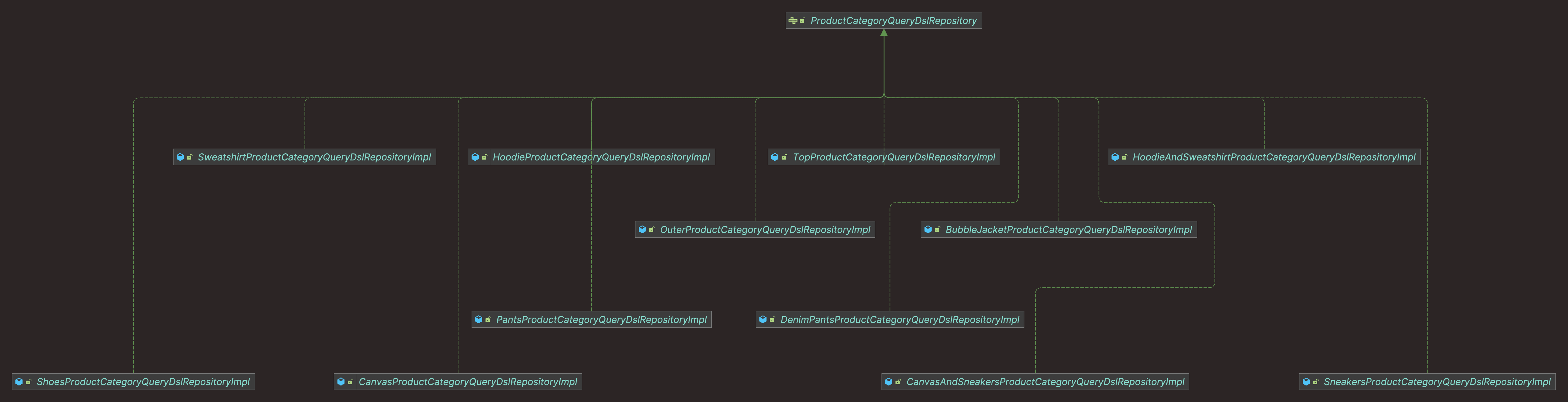 카테고리가 추가될 때마다 ProductCategoryQueryDslRepository의 구현체를 만들고 ProductCategoryQueryDslConfiguration을 수정해 주어야 합니다.상위 클래스인 ProductCategoryQueryDslRepository의 메서드가 변경되거나 추가되면 2번에서 언급한 많은 구현체들의 메서드도 변경하거나 추가해 줘야 합니다.