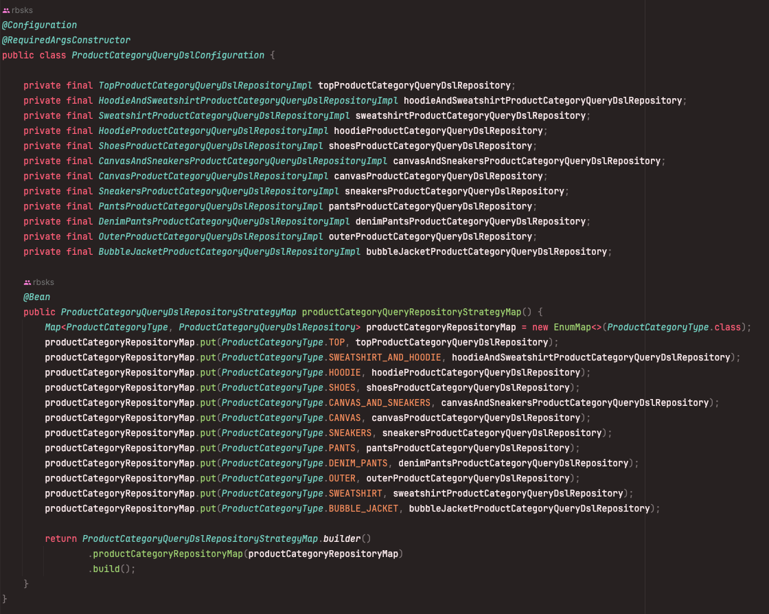 ProductCategoryQueryDslConfiguration 클래스에서 ProductCategoryType과 repository 구현체를 이용해 ProductCategoryQueryDslRepositoryStrategyMap은 Bean으로 등록해 주었습니다.