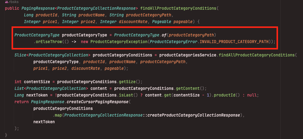 이어서 Controller가 의존하고 있는 Facade의 findAllProductCategoryConditions() 메서드를 보시면 파라미터로 전달받은 productCategoryPath를 ProductCategotryType의 static of() 메서드에 파라미터로 전달하고 호출하여 일치하는 ProductCategotryType을 찾게 됩니다.
