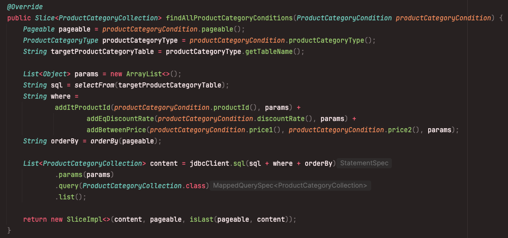 아래 사진에서 수정된 ProductCategoriesService의 findAllProductCategoryConditions() 메서드를 보시면 ProductCategoryQueryDslRepository를 찾는 부분이 제거됐고, ProductCategoryQueryDslRepository 대신 ProductCategoryJdbcRepository를 호출하는 것을 보실 수 있습니다.