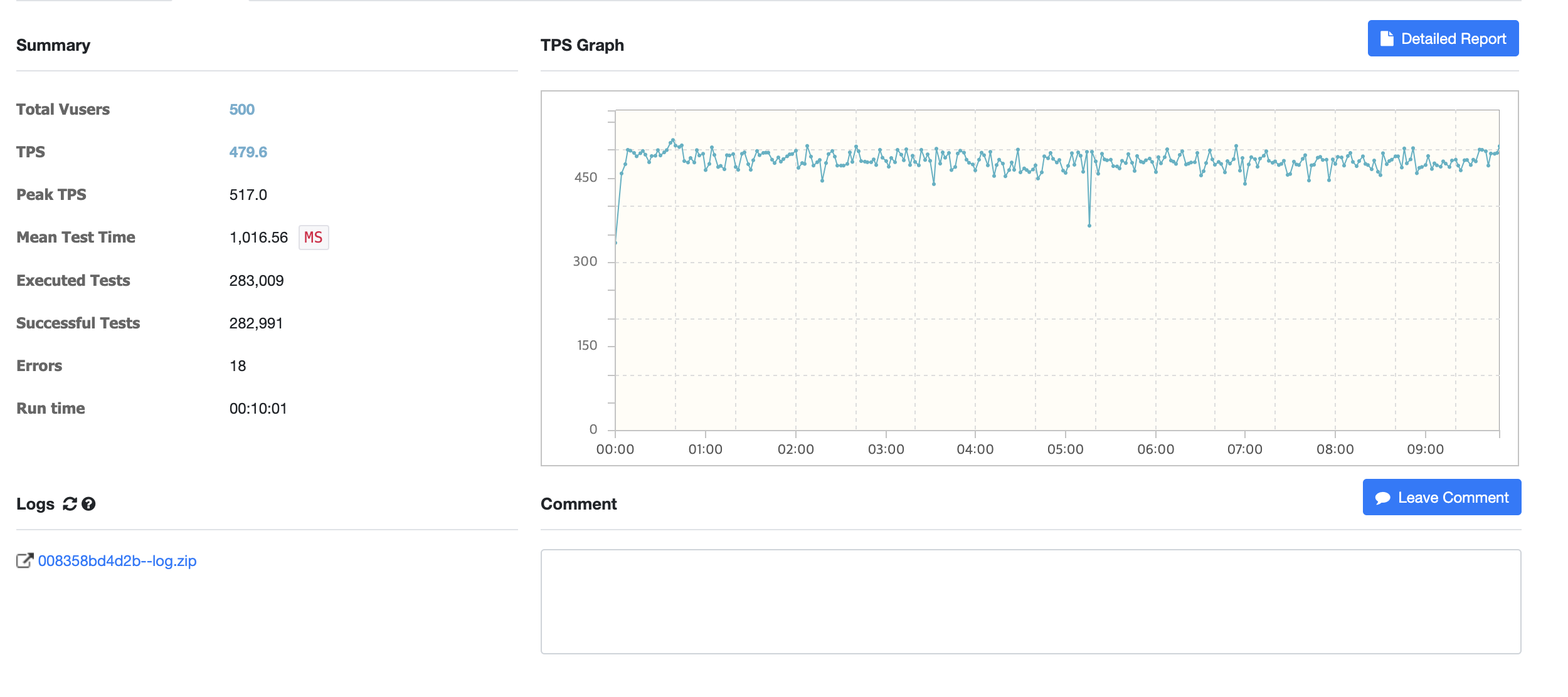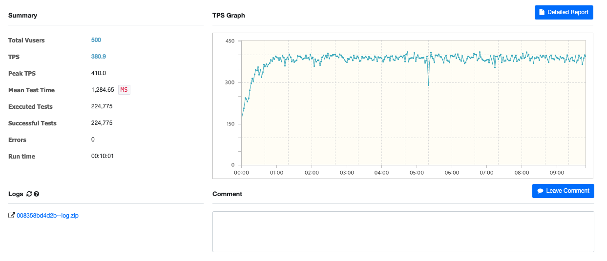 모든 테스트는 10분 동안 500명의 가상 유저를 사용하여 성능 테스트를 진행하였습니다.