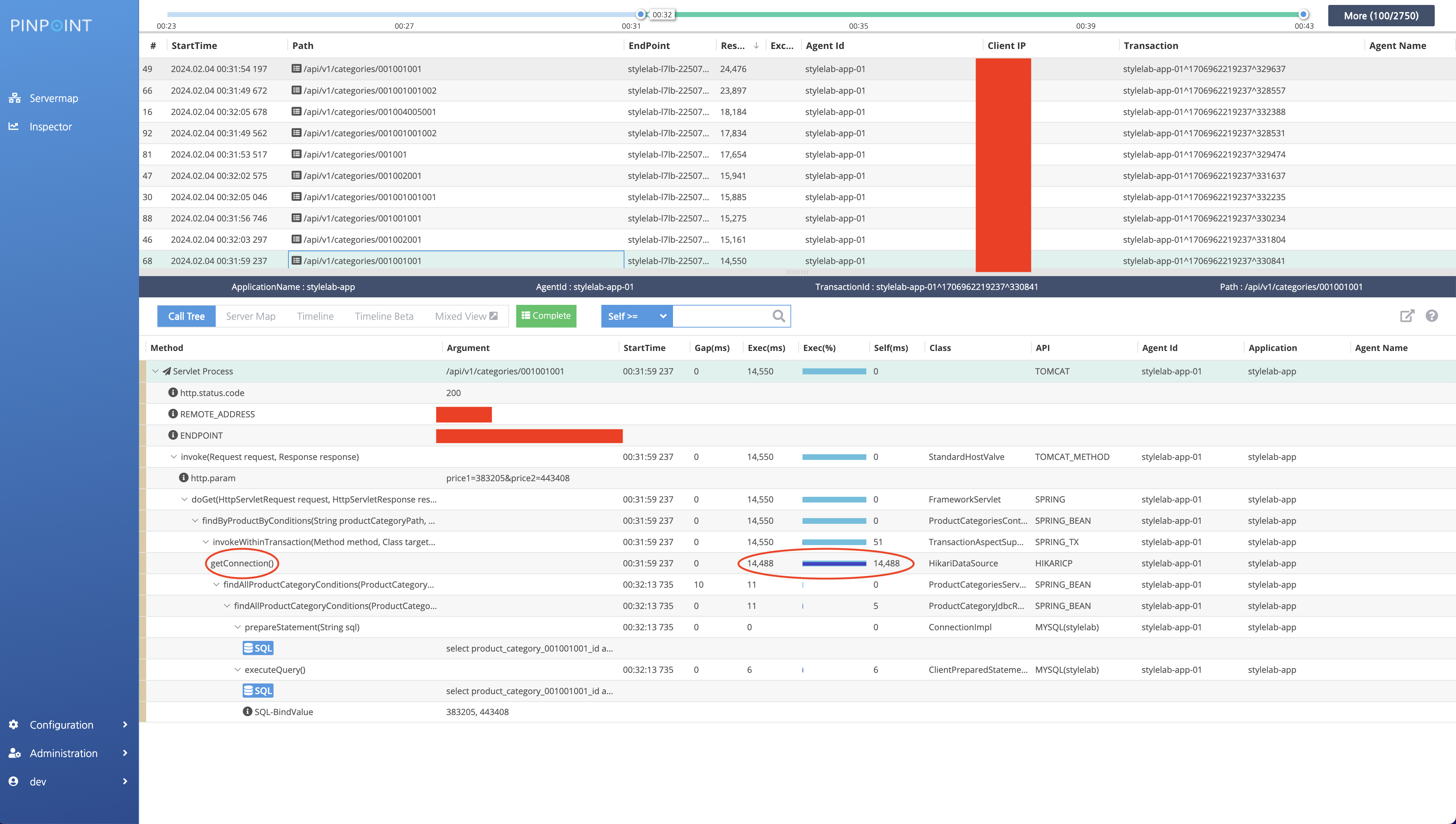 응답이 느린 요청들을 보시면 대부분 getConnection() 메서드에서 병목현상이 발견되었습니다. 그 외 다른 부분들은 실행 시간이 굉장히 빠른 것을 볼 수 있죠. 이런 병목현상을 로깅을 보고 찾기에는 굉장히 번거로운 작업이 될 수 있기 때문에 성능 테스트를 하기 전에는 꼭 APM을 도입 후 진행하는 것을 추천드리겠습니다.