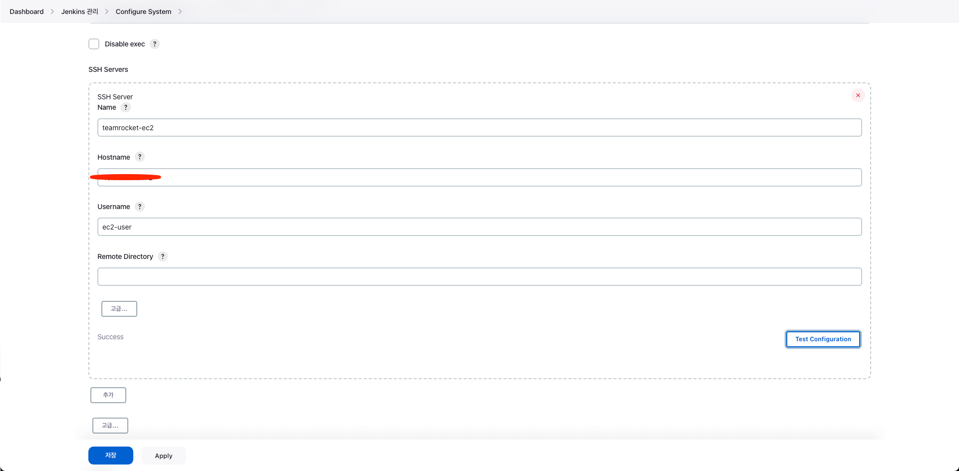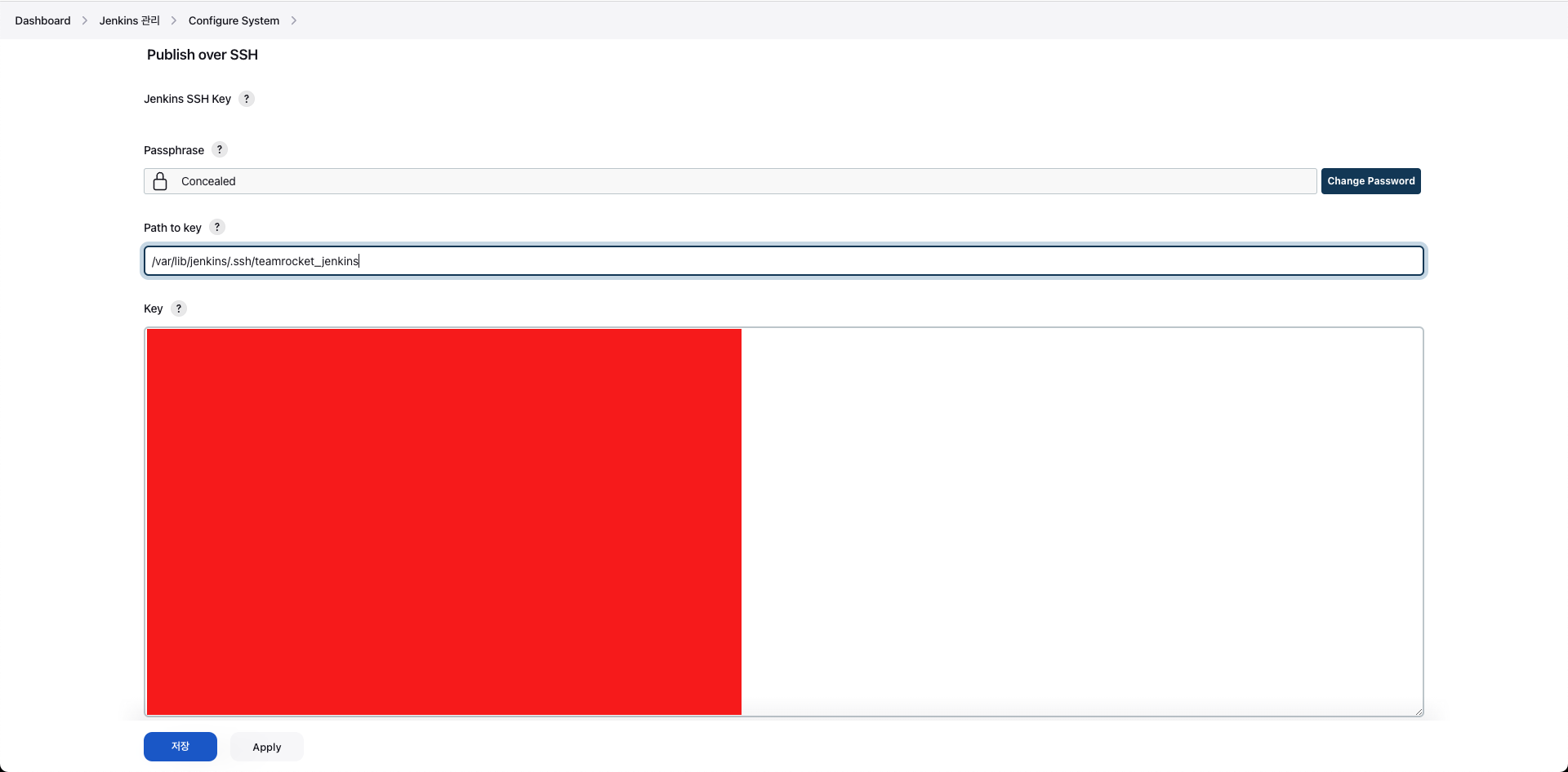 위의 작업이 끝났다면 Jenkins 관리 -> 플러그인 관리 -> Available plugins에서 Publish Over SSH를 설치하고 jenkins를 재시작 한다. 설치 후 Jenkins 관리 -> 시스템 설정 -> Publish Over SSH 탭에서 설정을 시작한다.