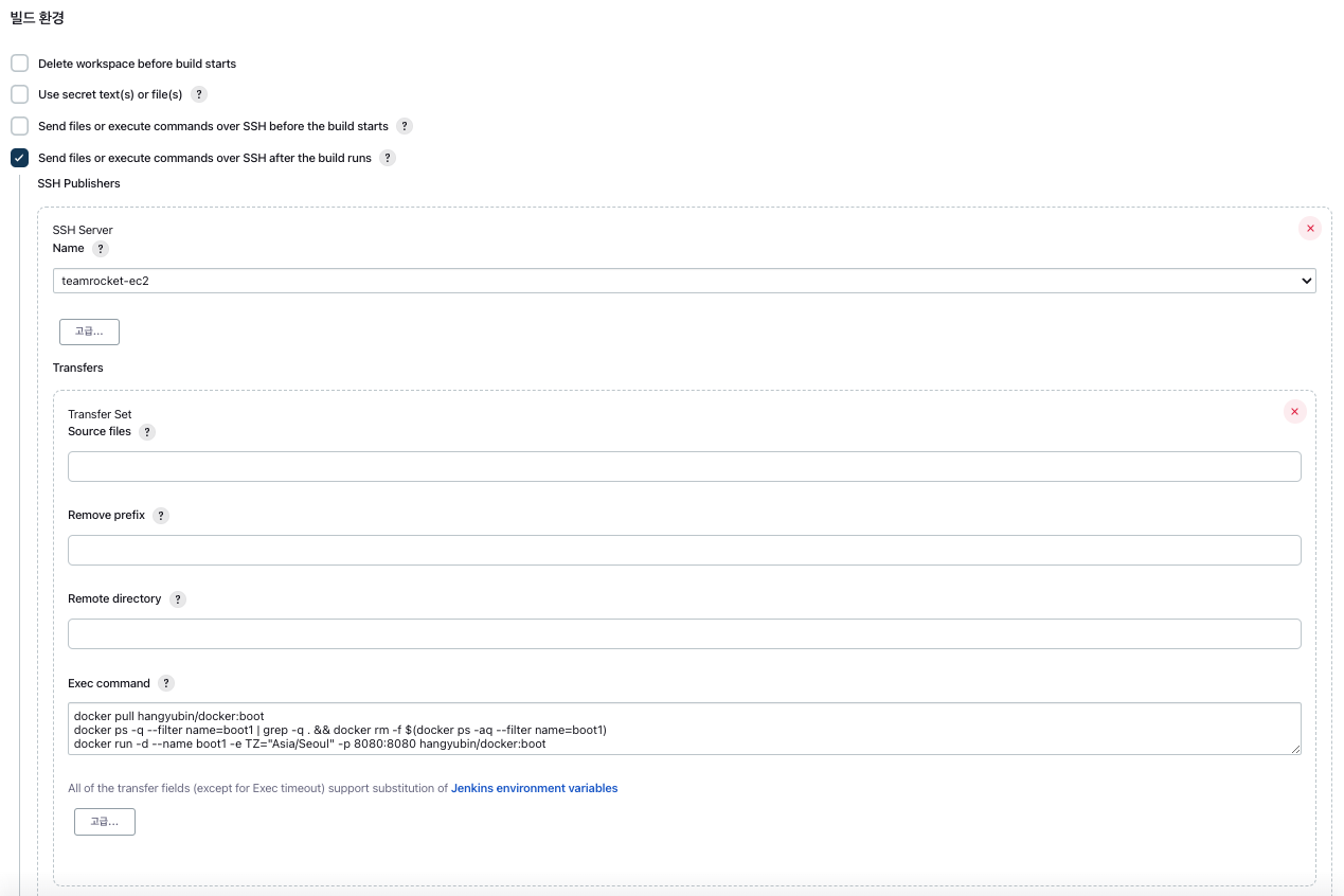 빌드 환경에서 Send files or excute commands over SSH after the build runs를 선택 후 아까 jenkins 관리 -> 시스템 설정 -> publish over ssh에서 설정한 SSH Server를 선택 후 Exec command에 배포 서버에서 어떤 명령어를 실행할 것인지 작성해주면 된다.