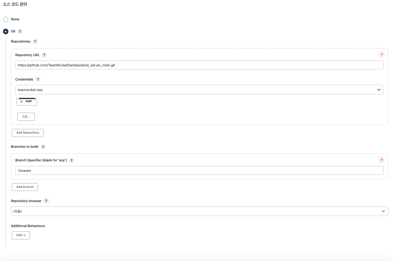 그 다음 소스 코드 관리 탭에서 실제 연결할 깃허브 레포지토리의 url을 입력 후 아까 생성해주었던 credential을 선택하여 준다.